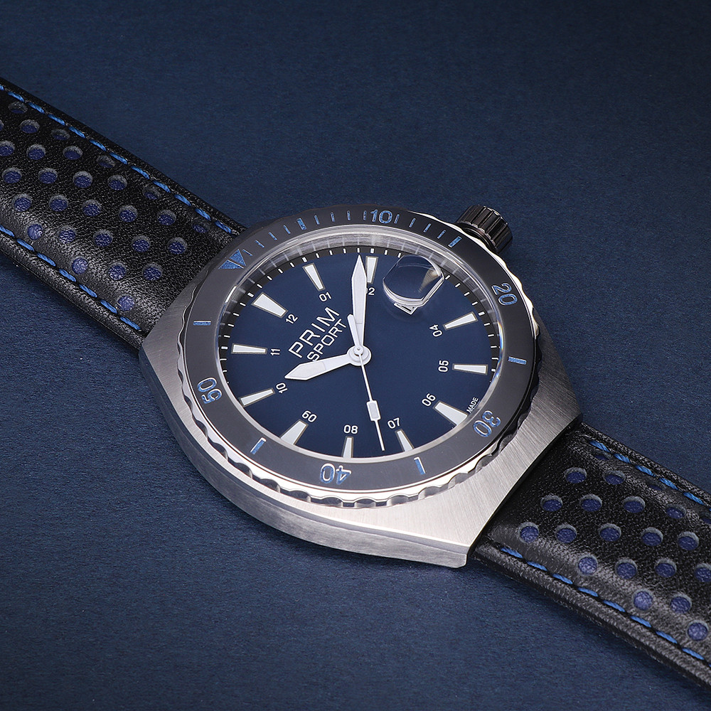 Na přelomu šedesátých a sedmdesátých let minulého století došlo v designu hodinek k obratu a začaly se objevovat nové atypické tvary. Inspirace zahraničím neminulo ani výrobu PRIM a tak jsme se oválným tvarem inspirovali znova. Jistotu, že tyto hodinky budou sloužit dlouhá léta Vám dává jejich kvalitní provedení ze špičkové ušlechtilé oceli 316L, kvalitní safírové antireflexní a anti-touch sklo a osvědčený prémiový japonský kalibr Miyota 9015. Nový je design pouzdra o velikosti 43 mm x 47 mm. Sportovci ocení šroubovací korunku, která zaručuje voděodolnost 10 ATM, což naši ambasadoři testují v extrémních podmínkách svých sportovních aktivit. I díky šroubovací korunce a víčku pouzdra na závit můžete s tímto modelem skákat do vody a potápět se. Tradiční tištěný ciferník s prvky sportovního vzhledu zaujme každého PRIM nadšence. Samozřejmostí jsou lumini prvky (kromě červené varianty) a luminiscenční keramická luneta. Na pozici 3 hodin je umístěno datumové okénko s lupou. Designéři navrhli sportovní ručky, které jsou pokryty japonskou super luminiscenční vrstvou pro lepší odpočet času za snížené viditelnosti. Hodinky jsou dodávány s kvalitním koženým řemínkem. UPOZORNUJEME: červená lumini je méně svítívá – jedná se o tmavou barvu! Na své si přijdou milovníci zelené, které připomínají populární barvu „PRIM Myslivec“ z roku 1972.